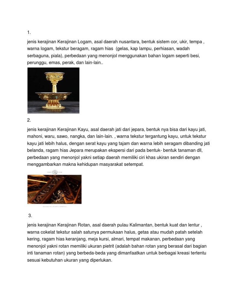 Jenis kerajinan kerajinan rotan, asal daerah pulau kalimantan, bentuk kuat dan lentur , warna cokelat tekstur salah satunya permukaan halus, getas atau mudah patah setelah kering, ragam hias keranjang, meja kursi, almari, tempat makanan, perbedaan yang menonjol yakni rotan memiliki.